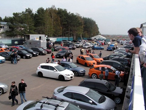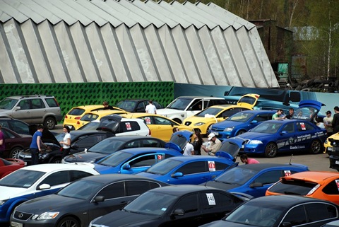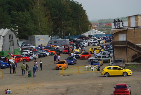 Парковка автодрома была переполнена автомобилями участников и болельщиков.